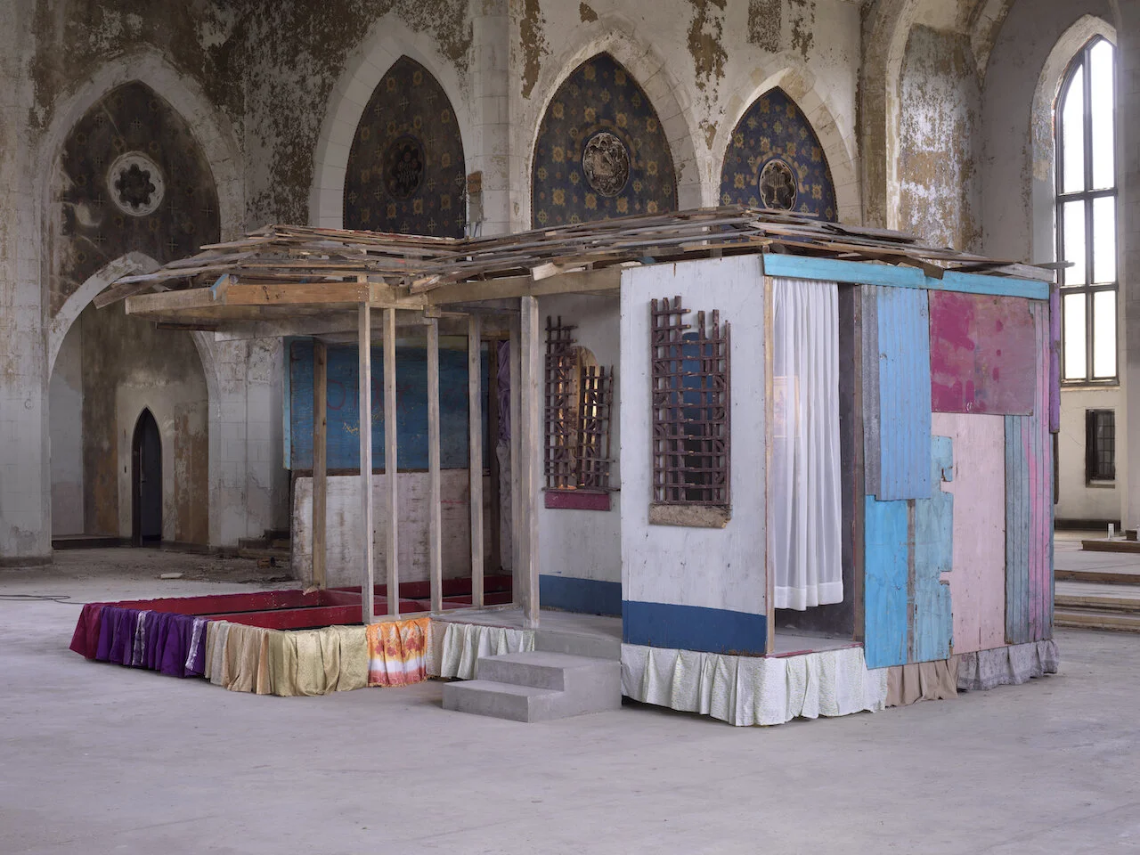 The act of “Dancing in the Spirit”, in which the Holy Spirit embodies the Believer, manifesting itself in unbridled song and dance, is a form of religious worship unique to the Pentecostal faith. It is here, within the crumbling grandeur of the former Wood’s Cathedral - once home to a progressive Black Pentecostal congregation who had journeyed North during the Great Migration of the 1920s and 1930s - where this deeply experiential form of spiritual transcendence once found refuge. Today, resting in its vacuous nave are relics of a different type of ritual worship, each carefully housed within Akeem Smith’s SOURSOP, a sculptural installation formed from the dilapidated remnants of a domestic structure from his childhood neighborhood -- Kingston Jamaica’s Waterhouse District. Part of a larger body of work that pulls from the artist’s vast shadow archive of Jamaican dancehall documentation, this conspicuous intervention transforms the church into a station through which multiple polyphonic narratives of diasporic movement, collective transcendence, and urban and moral decay intersect.